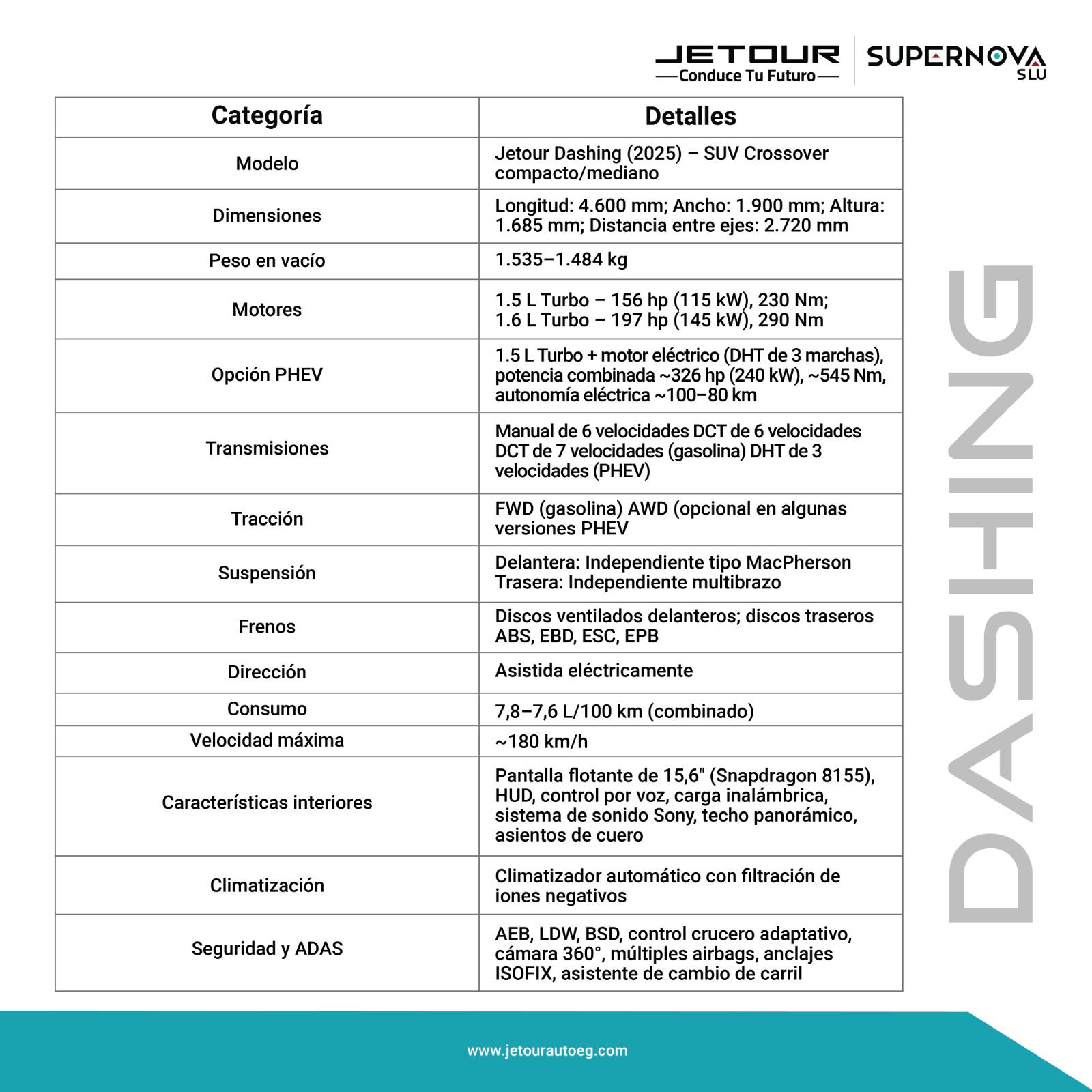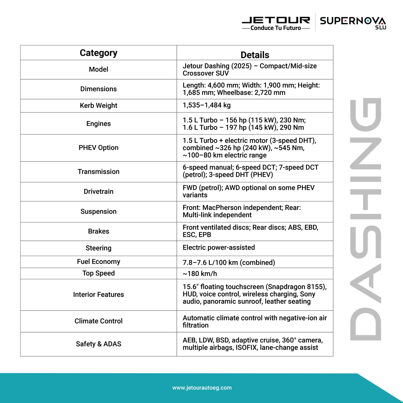 Drive in style and enjoy ultimate comfort with Jetour Dashing, powered by a 1.6L turbocharged engine delivering 197 hp for power and stability in all conditions. Featuring a striking exterior design and a spacious 5-seater configuration, experience a one-of-a-kind cabin that offers world-class comfort and luxury. The Jetour Dashing also features innovative technology and is coupled with intelligent safety features making it your perfect travel companion.